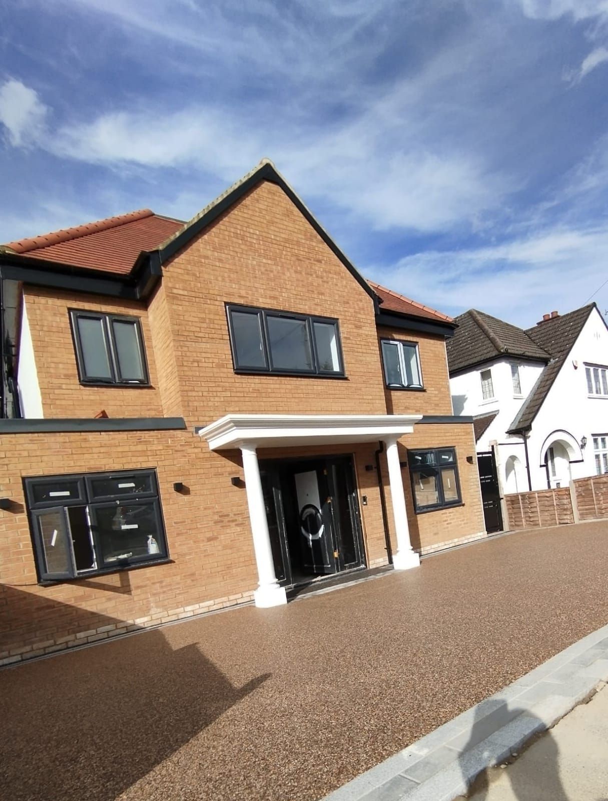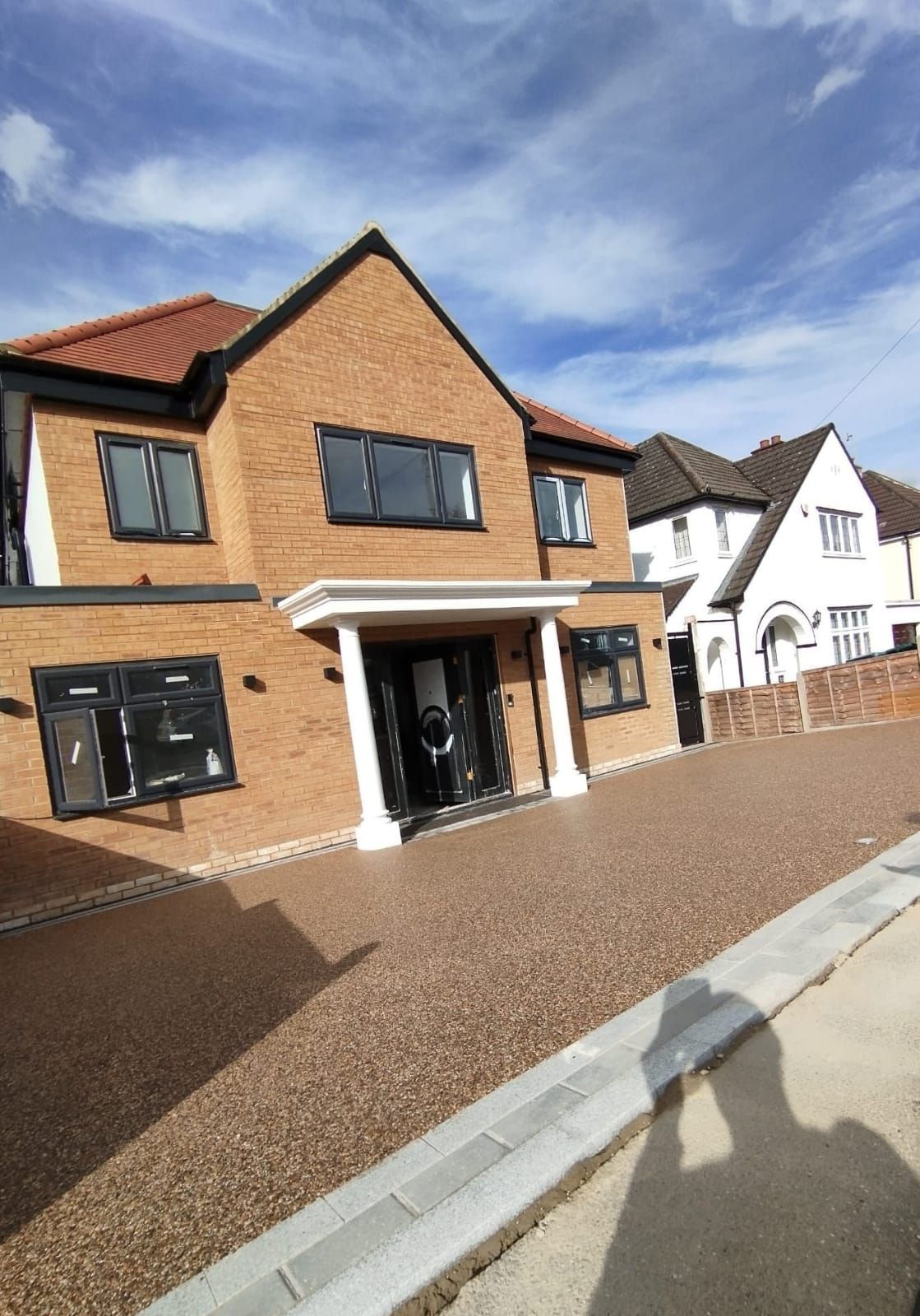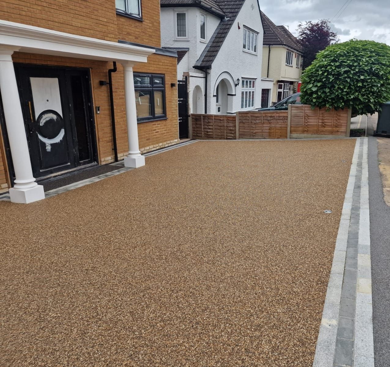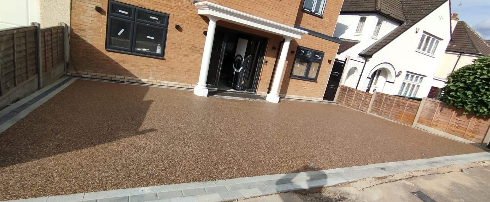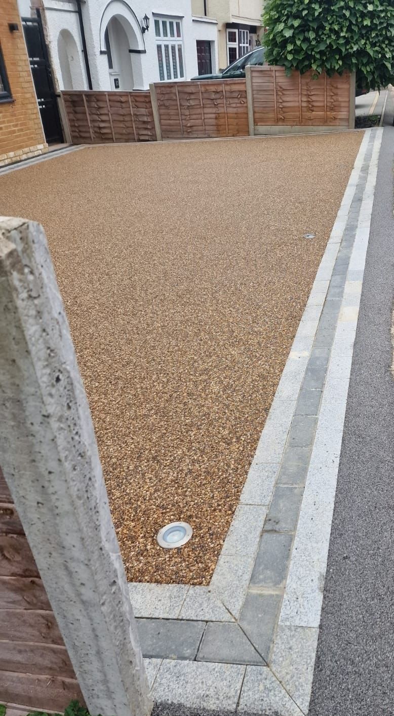 Visual display of a Cappuccino Colour driveway on resin installation with granite sets as a border.